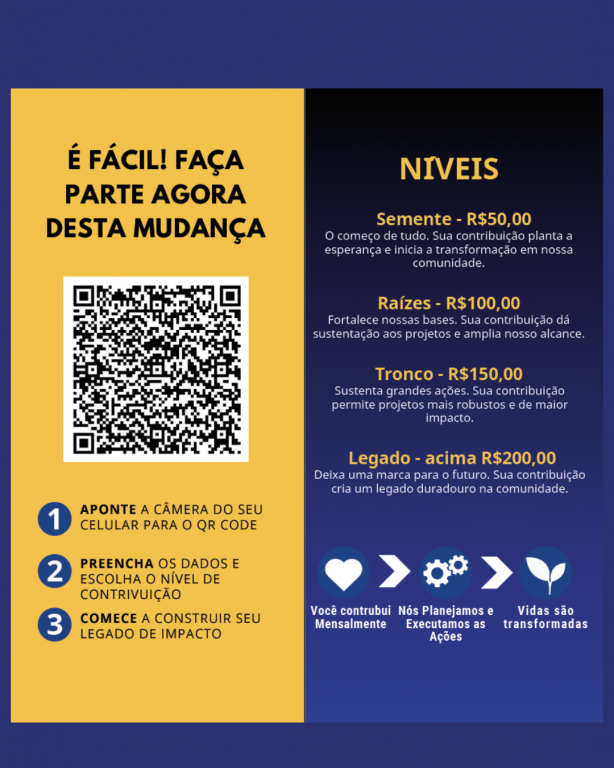 "A rotina pode ser corrida. Mas a vontade de ajudar continua viva. O programa Companheiro de Impacto é a ponte entre o desejo de servir e a ação real. É a sua chance de construir um legado de transformação, mesmo sem estar presente todas as semanas."