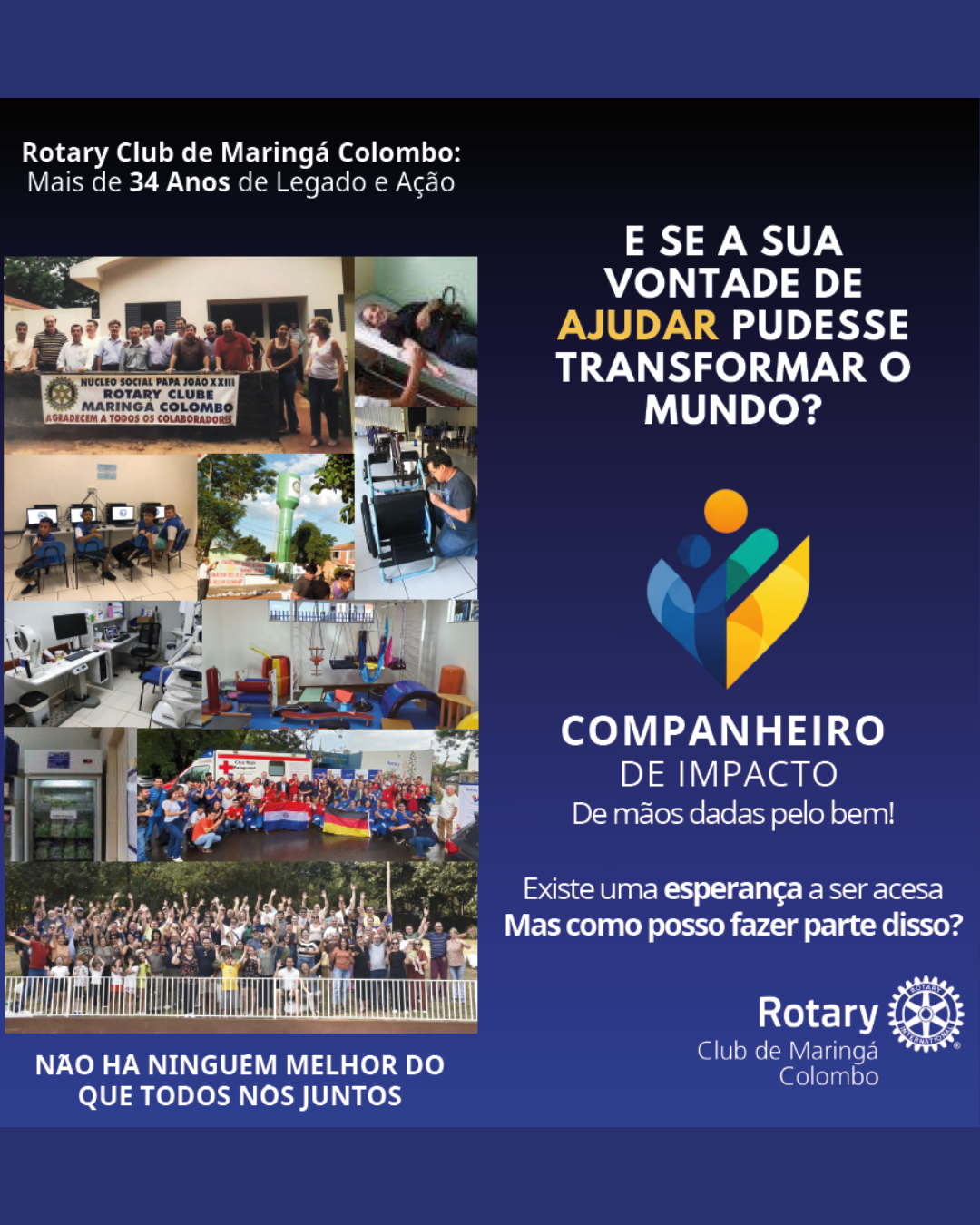 No dia 12 de julho de 2025, durante a solenidade de posse da nova presidência do Rotary Club de Maringá Colombo para a gestão 2025/2026, foi realizado o lançamento oficial do programa Companheiro de Impacto, uma iniciativa que marca um novo momento de engajamento e participação comunitária em nossa trajetória rotária.