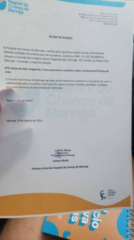 No dia 28 de agosto de 2025, o Rotary Club de Maringá Colombo promoveu uma importante ação solidária em prol do Hospital da Criança de Maringá: a entrega de 672 caixas de leite integral de 1 litro, totalizando 672 litros.